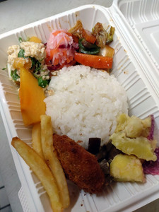 今回はボランティアグループの大学生や高校生が活動に参加してくれるとのことで楽しみにしていました。 厨房の中で盛り付け作業に頑張っていただきました。